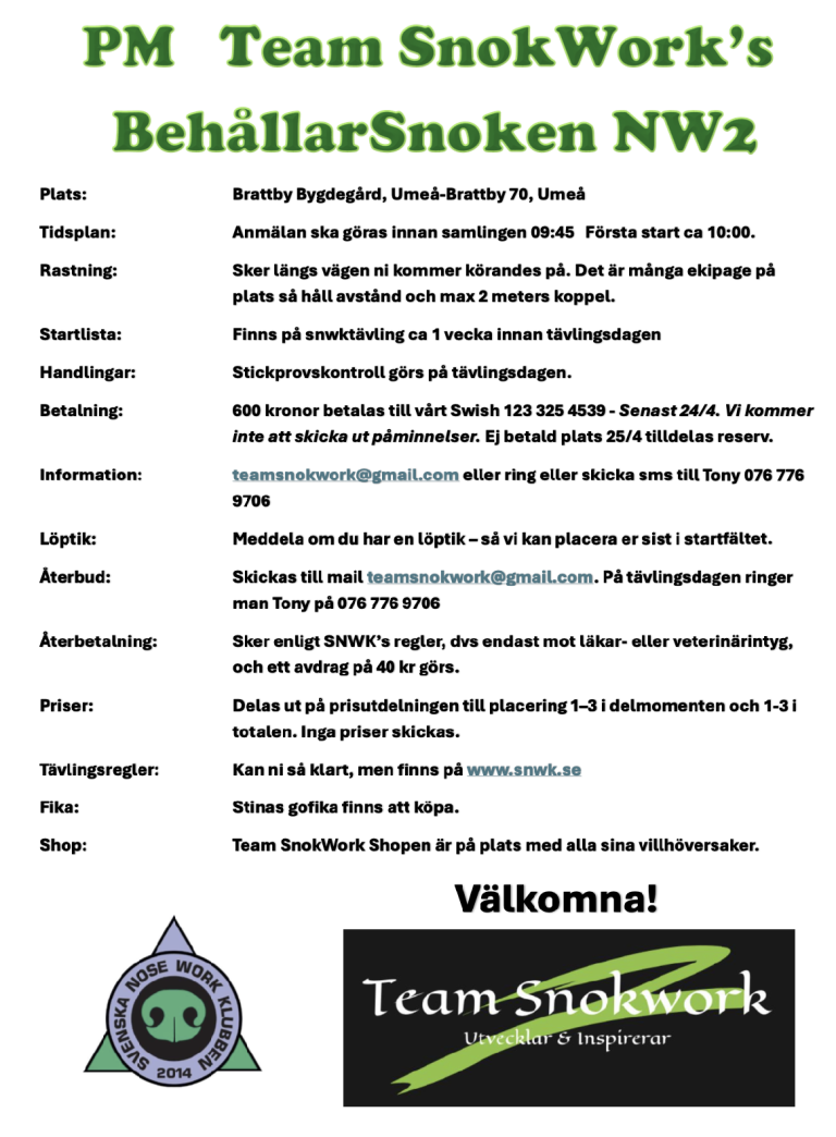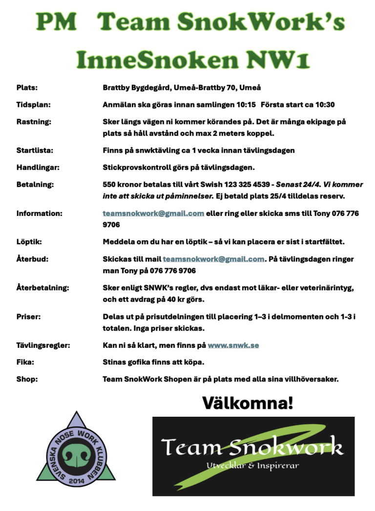 Frågor, återbud, anmälan om löptik mm görs på mail till teamsnokwork@gmail.com eller ring Tony 076 776 9706, Marie 070 238 3812.